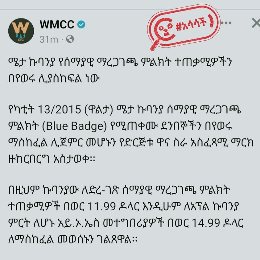 የሜታ ኩባንያን ሰማያዊ ማረጋገጫ በተመለከተ ከተጋራ አሳሳች መረጃ እንጠንቀቅ!