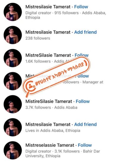 የታዋቂ ግለሰቦችን እና ተቋማትን ስም እና ምስል (አርማ) በመጠቀም የሚከፈቱ ሀሰተኛ የማህበራዊ ትስስር ገጾች እና አካዉንቶች ለሀሰተኛ እና አሳሳች መረጃዎች ሊያጋልጡን ስለሚችሉ ተገቢዉን ጥንቃቄ እናድርግ።