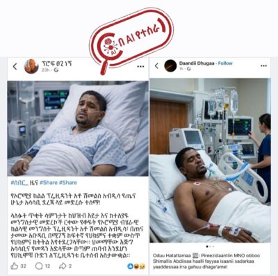 አቶ ሽመልስ አብዲሳ በአቡ ዳቢ ከተማ ህክምና ላይ እያሉ ‘ያሳያሉ’ በሚል እየተጋሩ ያሉ ምስሎች በሰው ሰራሽ አስተዉሎት (AI) የተፈበረኩ ናቸው