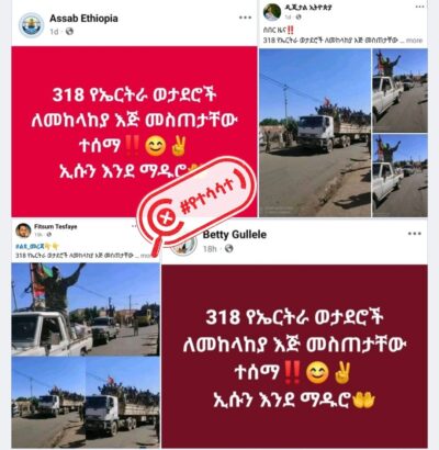 ከነዚህም መሀል ‘ፍፁም ተስፋዬ’ በሚል ስም የተከፈተ ከ33,000 በላይ ተከታዮች ያሉት የፌስቡክ ገፅ 318 የኤርትራ ወታደሮች ለኢትዮጵያ መከላከያ ሰራዊት እጃቸውን መስጠታቸውን በመጥቀስ መረጃ አጋርቷል። በዚህ ገፅ የተጋራውን መረጀ 58 ተጠቃሚዎች መልሰው ያጋሩት ሲሆን 211 የሚሆኑት አስተያየቶች ሰጥተውበታል።